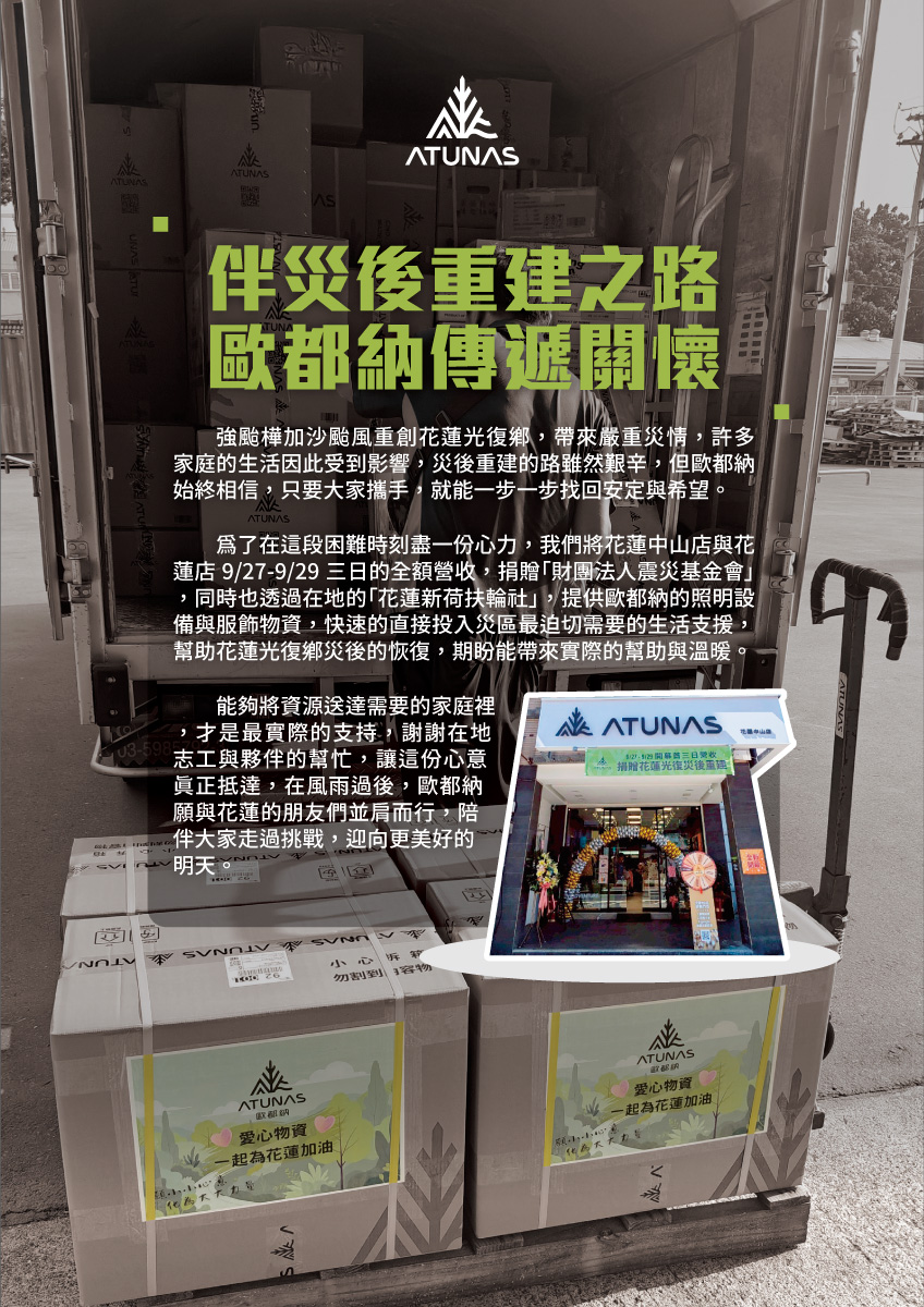 為了在這段困難時刻盡一份心力,我們將花蓮中山店與花蓮店9/27-9/29三日的全額營收,捐贈「財團法人震災基金會」,同時也透過在地的「花蓮新荷扶輪社」,提供歐都納的照明設備與服飾物資,快速的直接投入災區最迫切需要的生活支援,幫助花蓮光復鄉災後的恢復,期盼能帶來實際的幫助與溫暖。